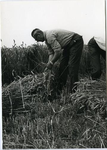 Foto in zwart-wit van een maaidorser merk New Hollan...