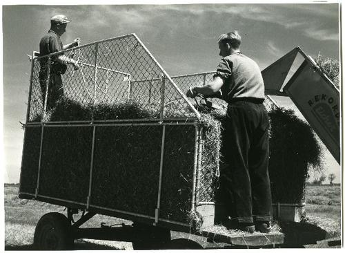 Foto in zwart-wit van de ontvangst van melkbussen bi...