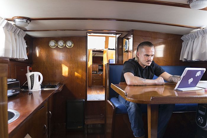 Portret van Peter en Eugeniu in hun woonboot aan de ...