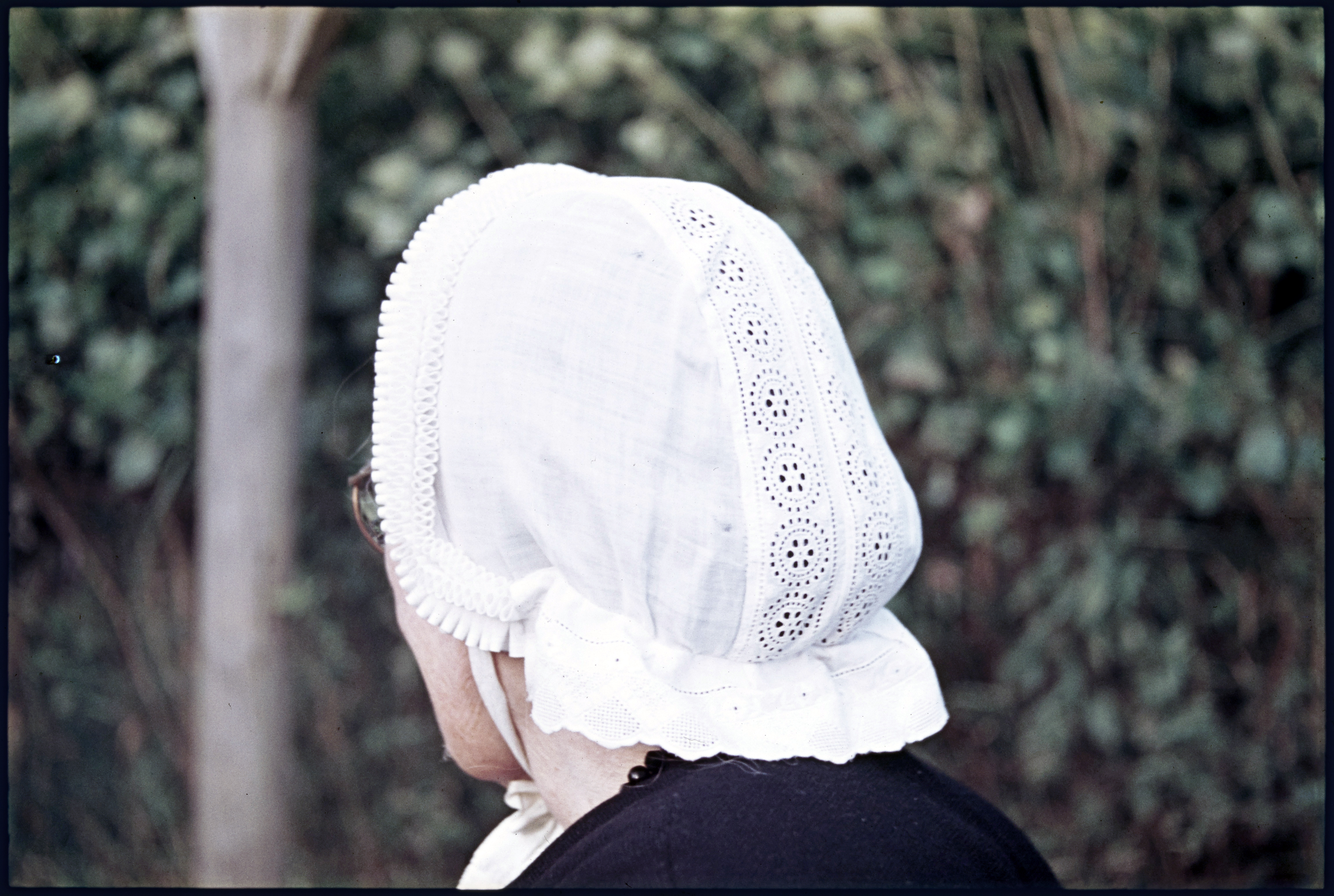 Vrouwen met tdriestrookmuts en slingerdoek; zijaanzicht
