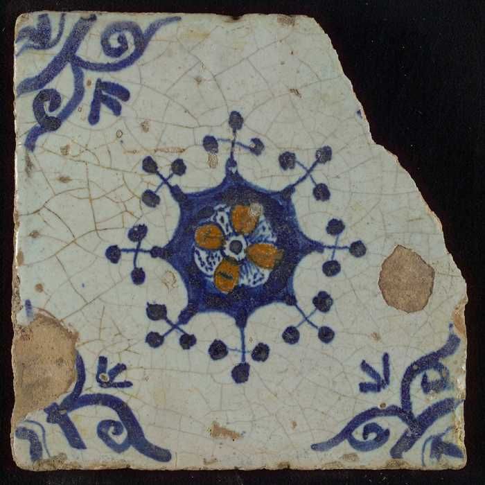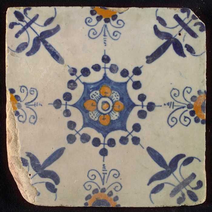 Ornamenttegel, blauwe trek en oranje op wit, bloem b...