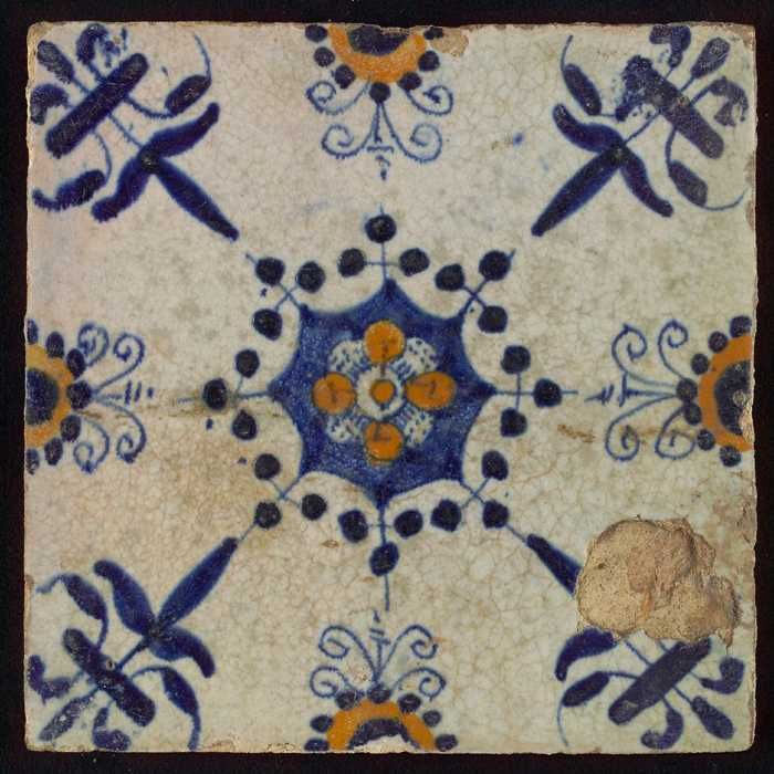 Ornamenttegel, blauwe trek en oranje op wit, centraa...