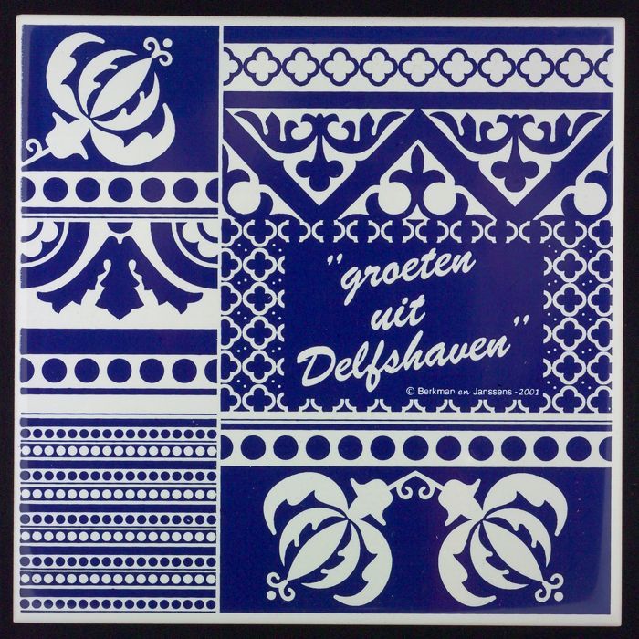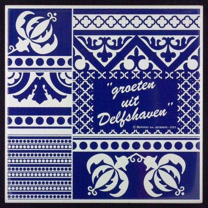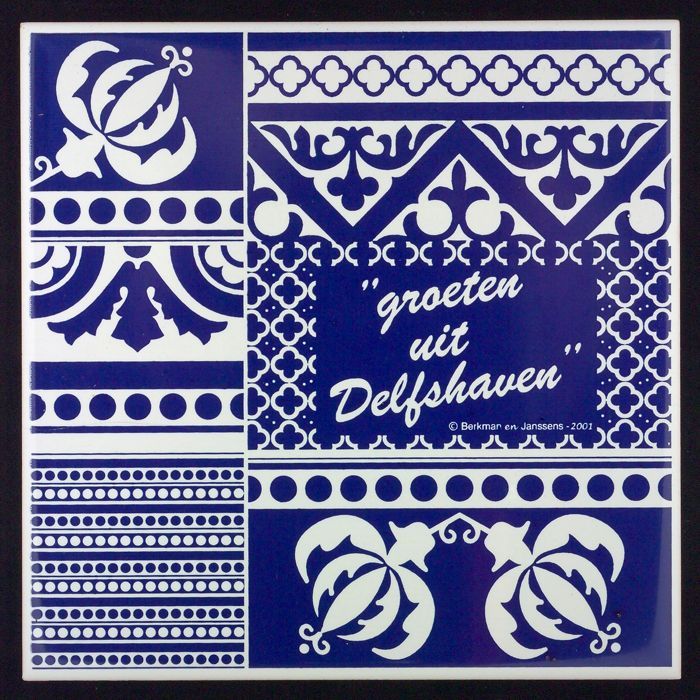 Blauw-witte tegel met opschrift "groeten uit Delfsha...