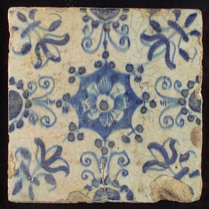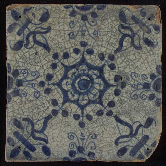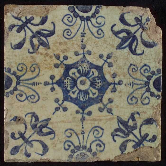 Ornamenttegel, blauw op wit, bloem binnen een stervo...