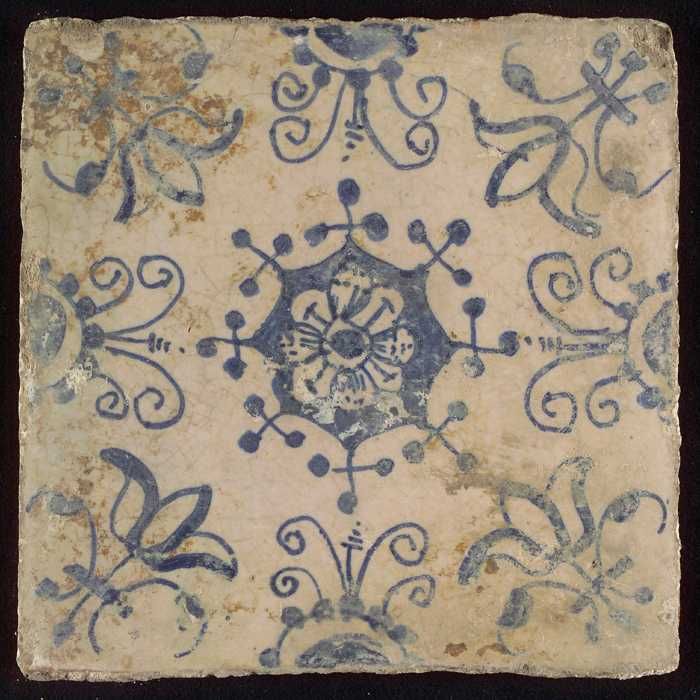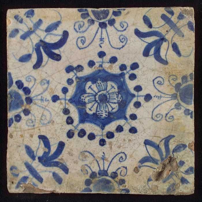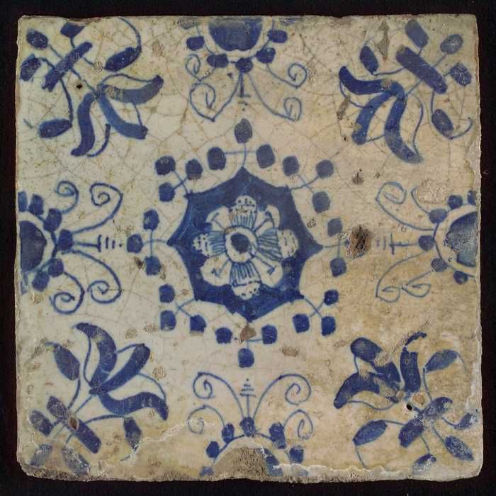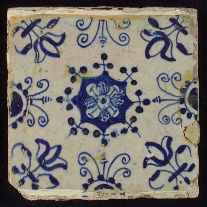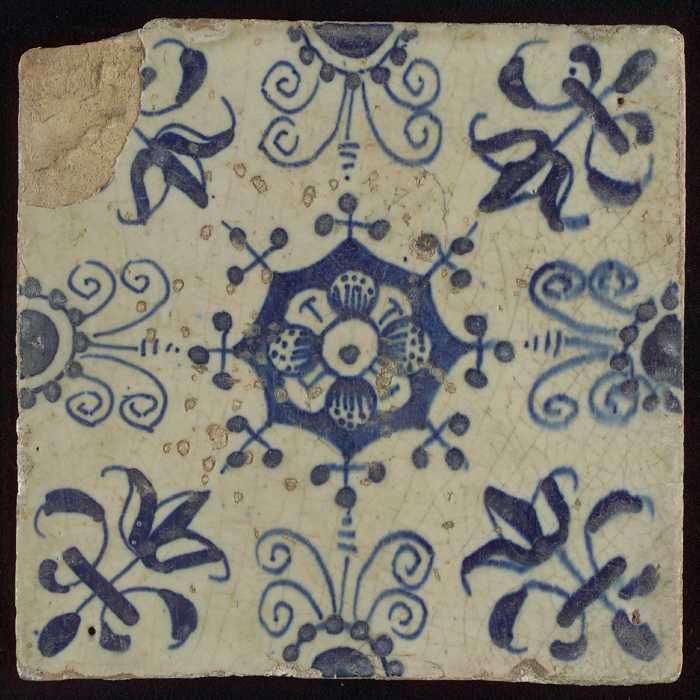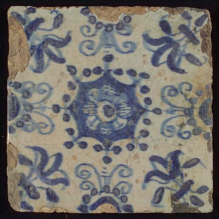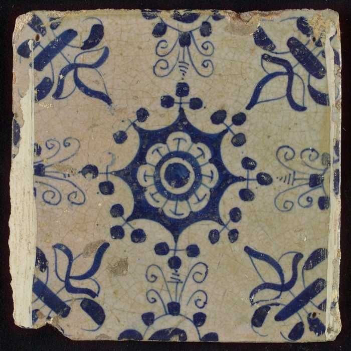Ornamenttegel, blauw op wit, bloem binnen een stervo...