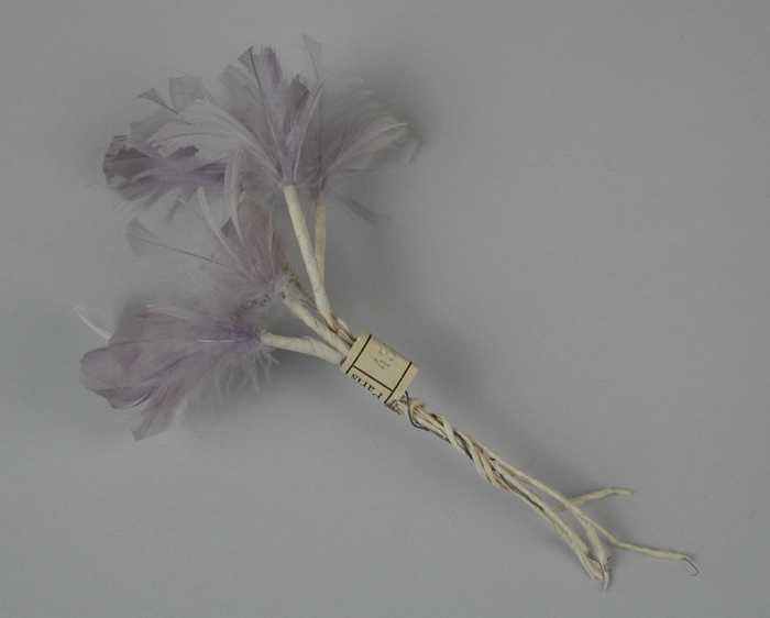 Veren hoedendecoratie, zes met wit papier omwikkelde...