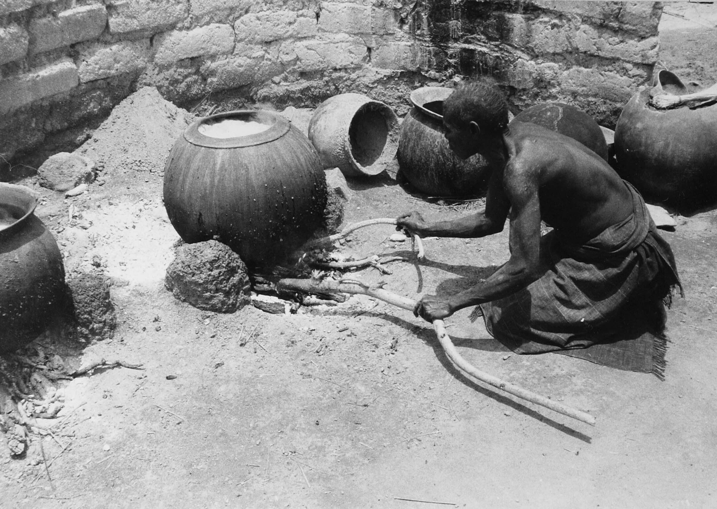Een Mossi vrouw stookt het vuur op onder een pot met...