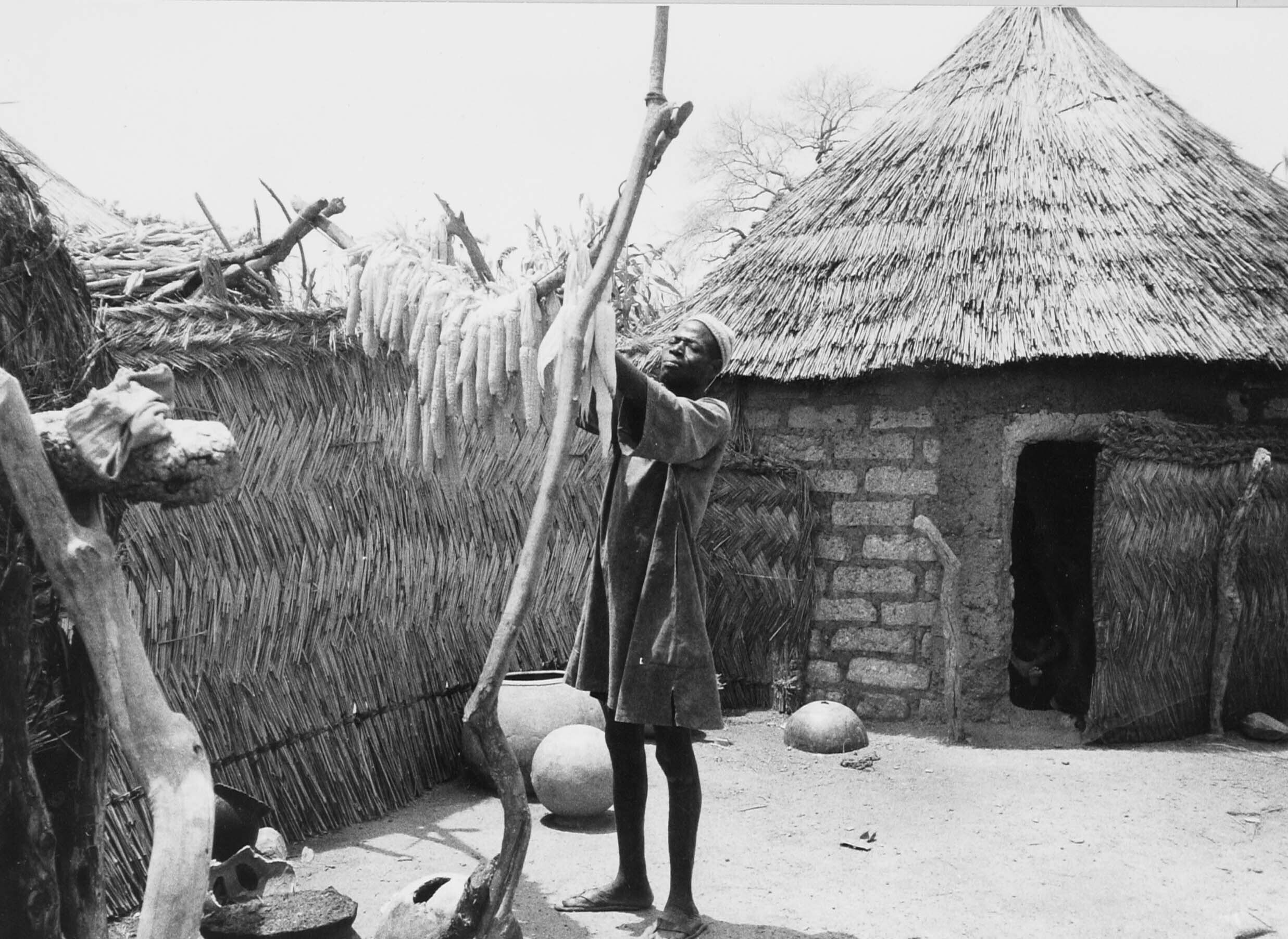 Een Mossi man hangt maiskolven te drogen op zijn woo...