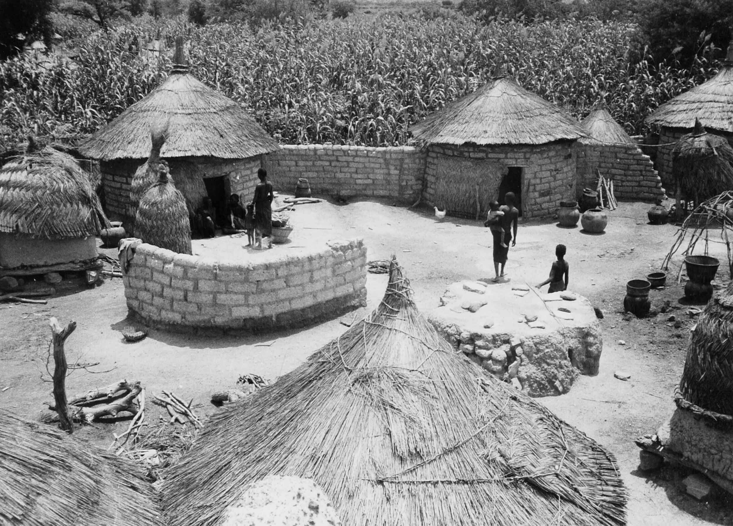Een Mossi woonerf met gemetselde huizen en maisvelde...