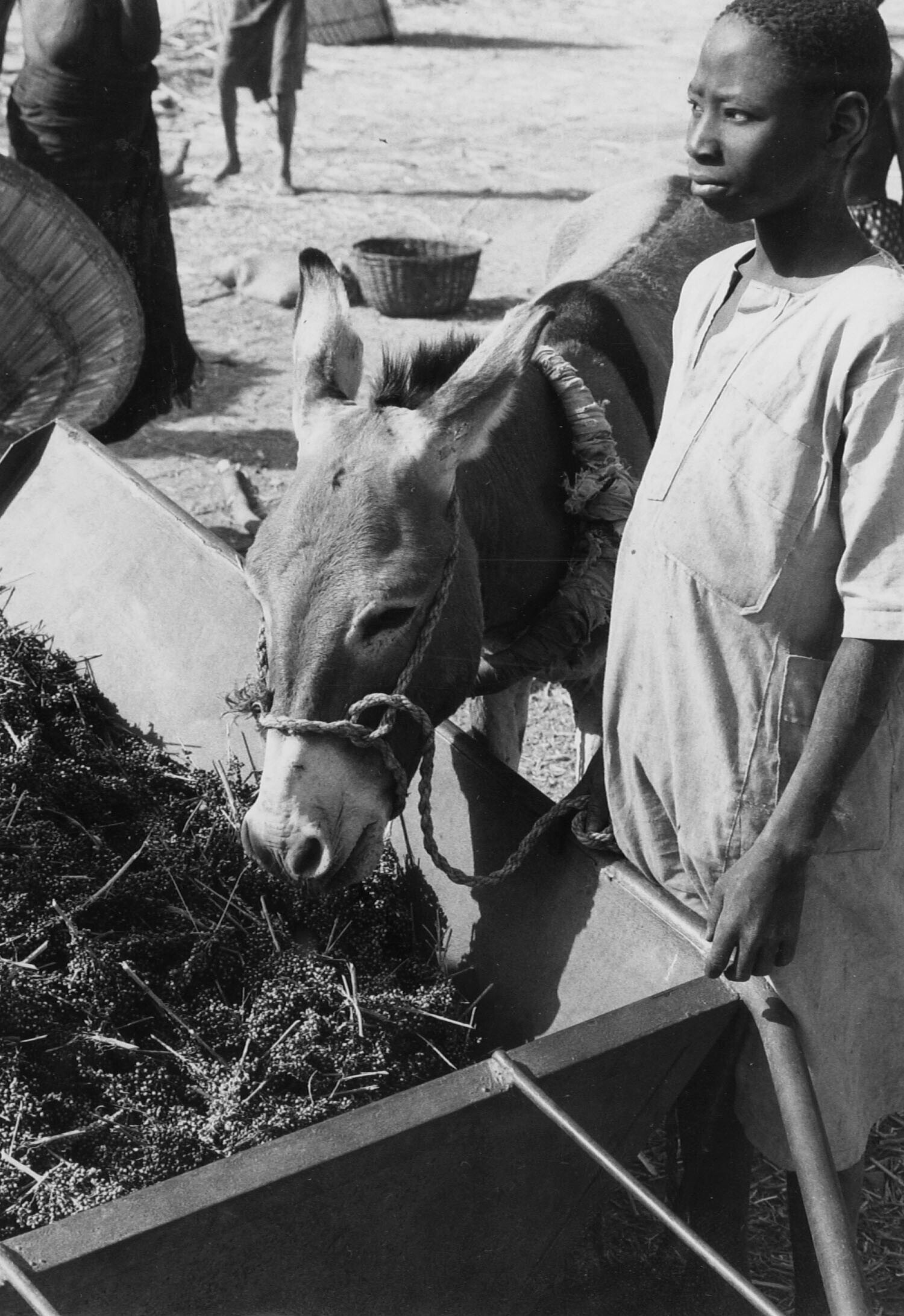 De mil of sorghum wordt in manden of met wagentjes n...