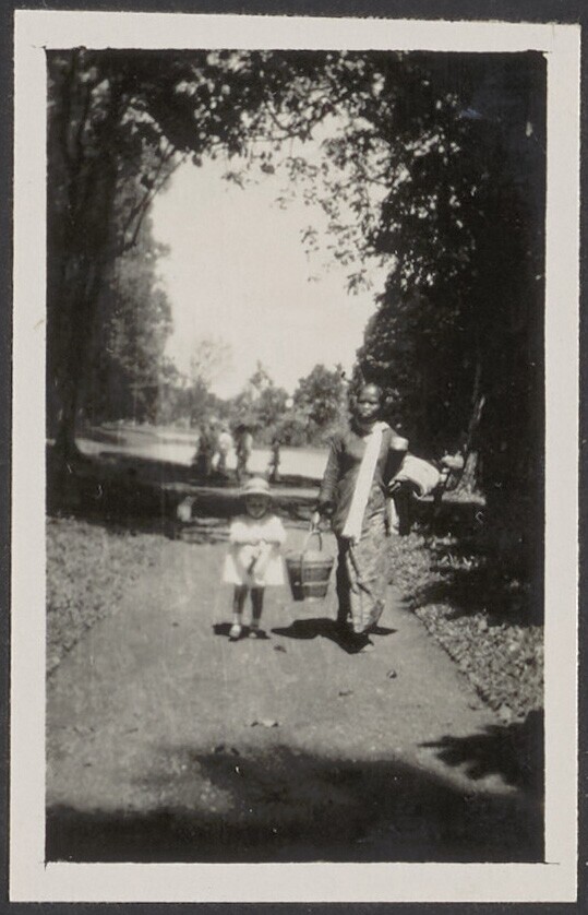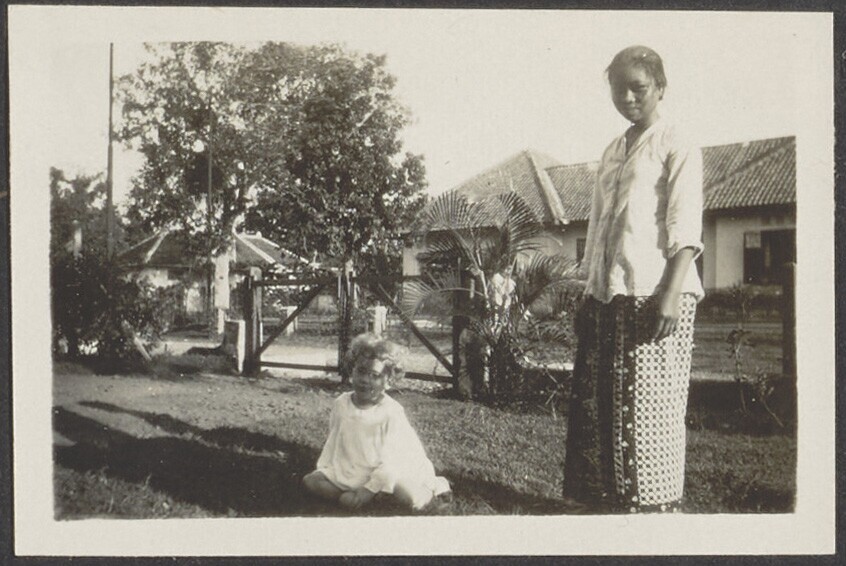 Europese vrouw met kind en een Javaanse kinderverzor...