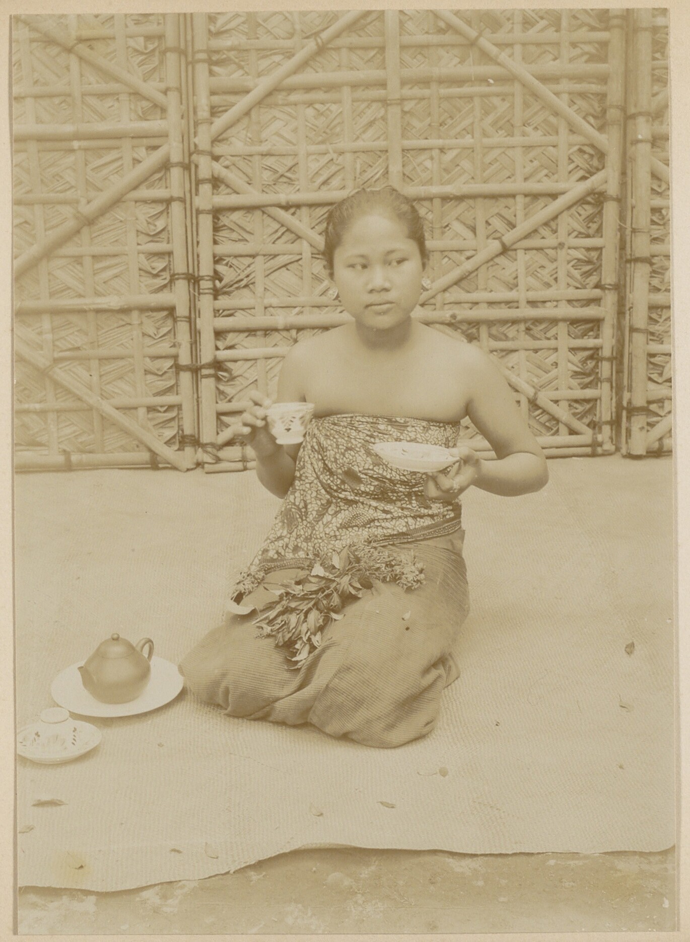 Portret van Javaanse vrouw met tabakspruim in haar mond