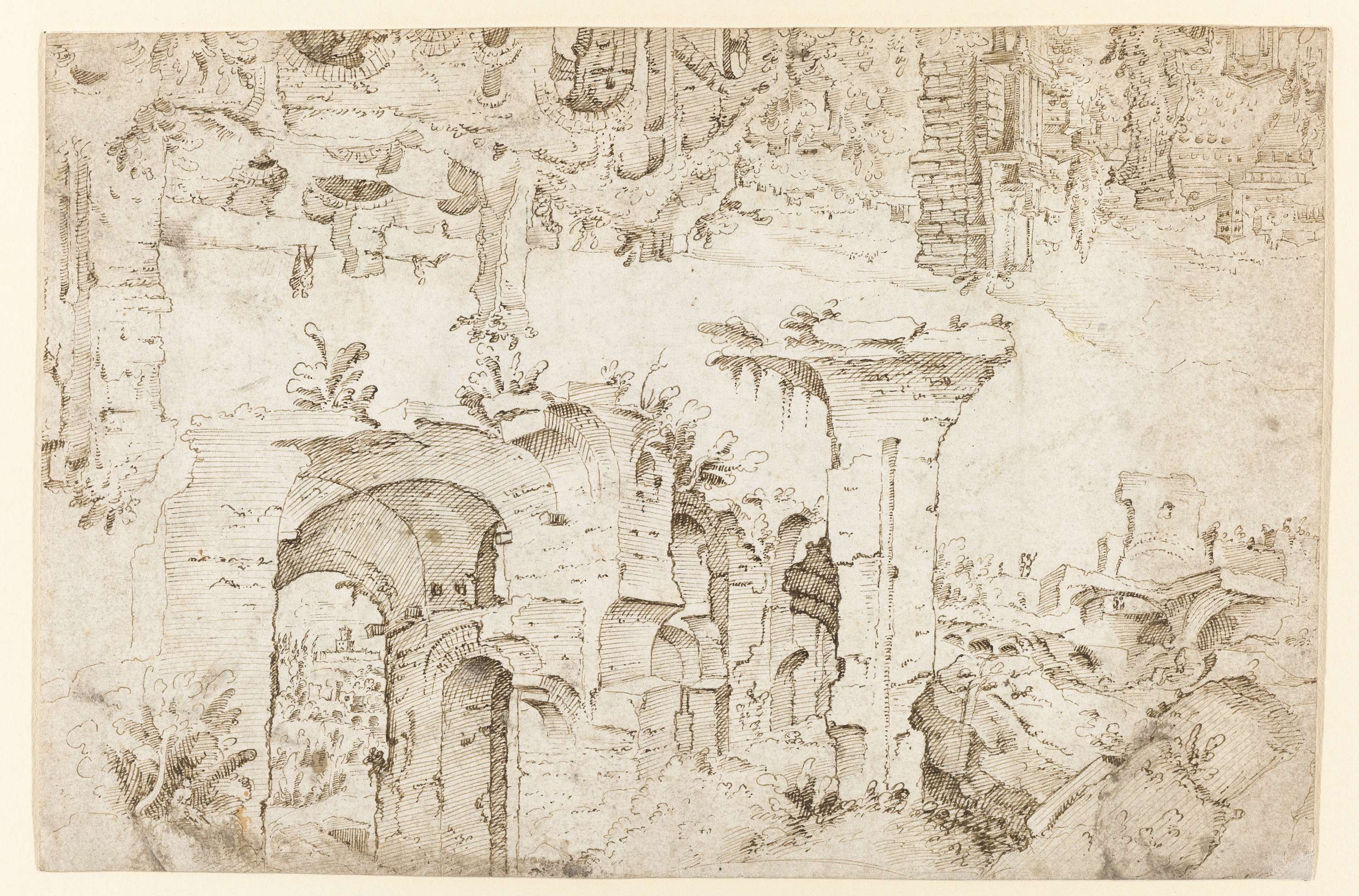Een ongeïdentificeerde ruïne in Rome; op de achtergr...