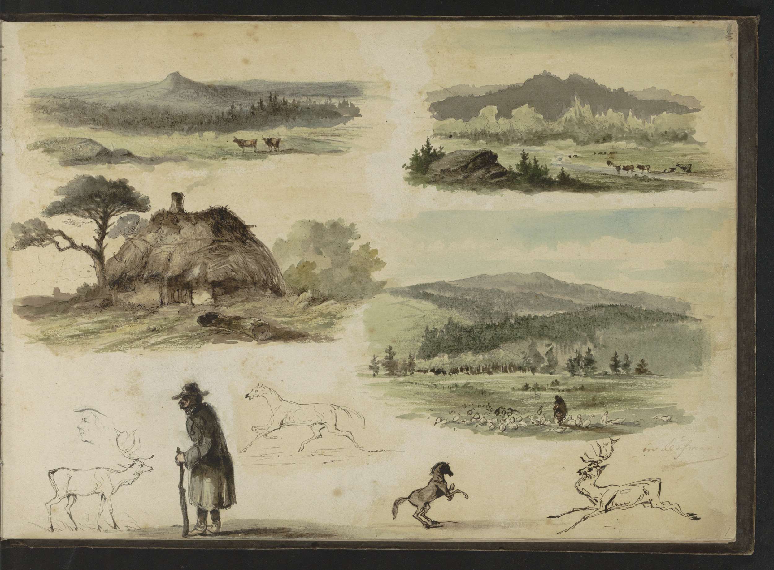 Herten, paarden, een herder en landschappen