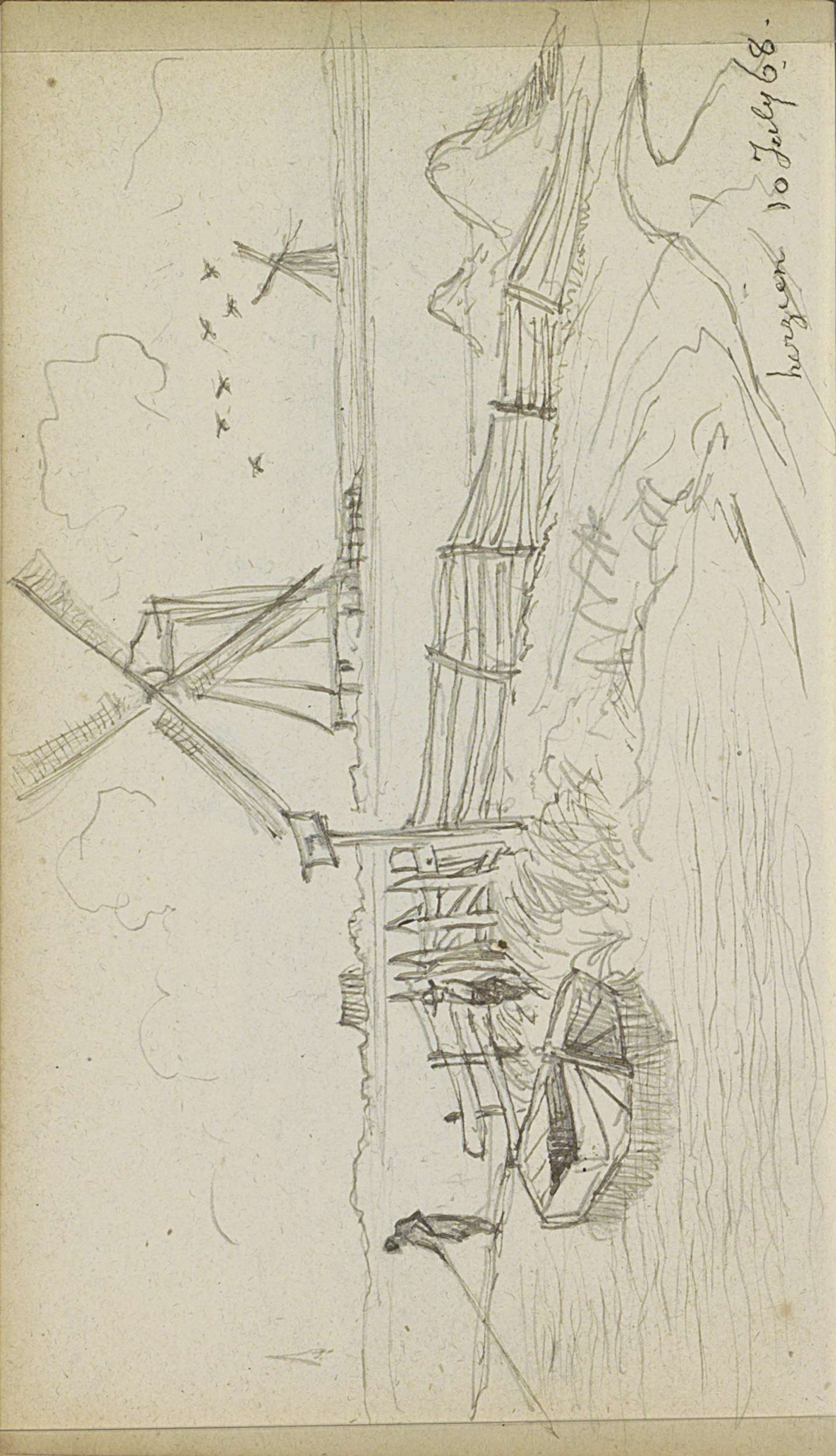 Landschap met molens en een figuur bij een sloot