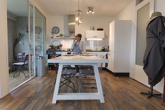 Portret van Maria en haar gezin in hun hun woonkamer...