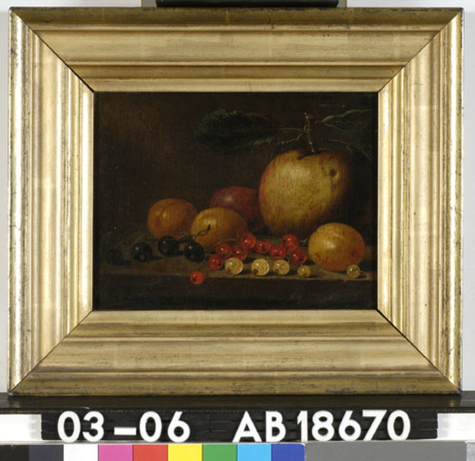 Stilleven van aalbessen, appels en pruimen
