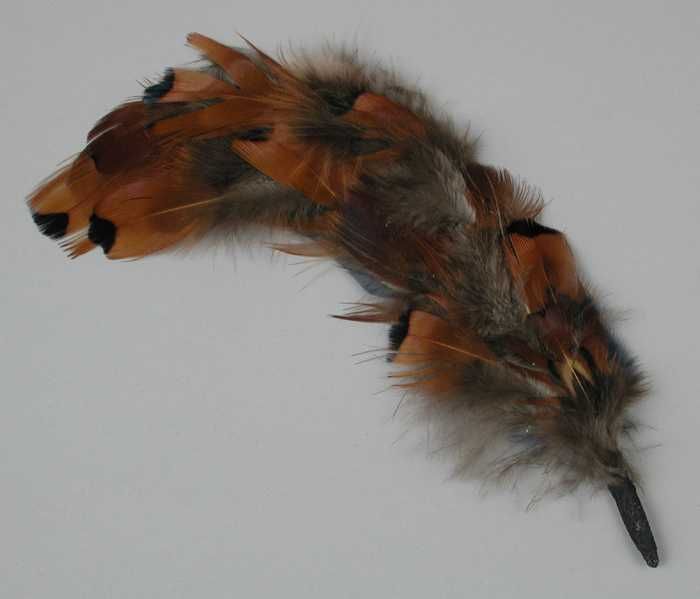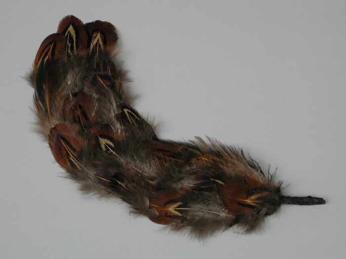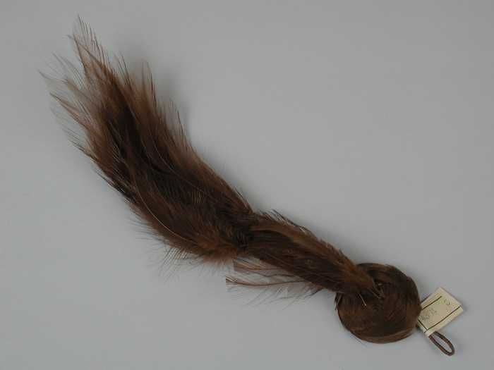Veren hoedendecoratie of corsage, stukje donkerbruin...