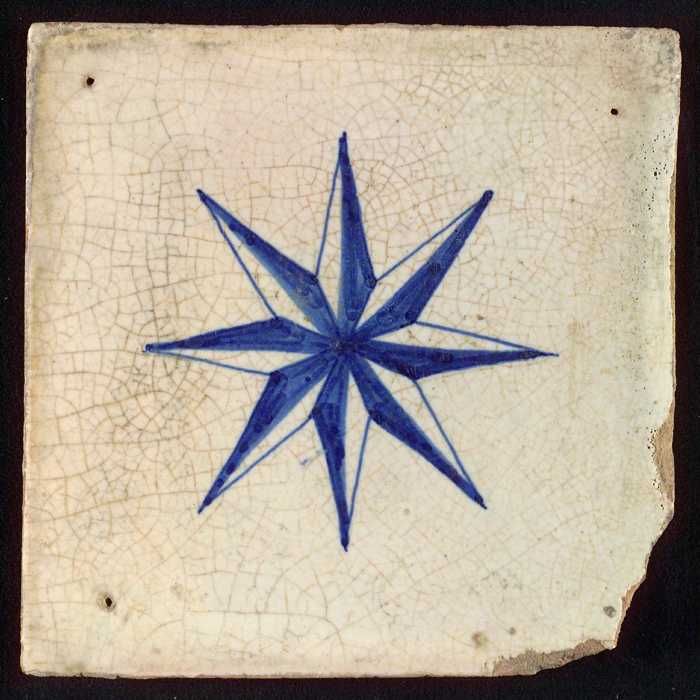 Ornamenttegel, blauw op wit, centraal een fijne acht...