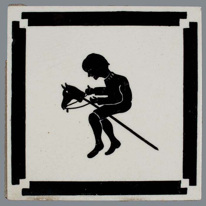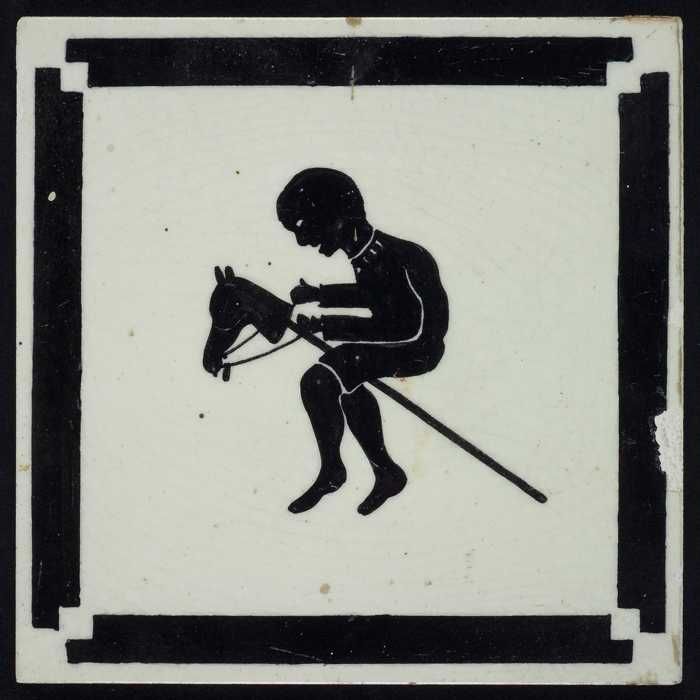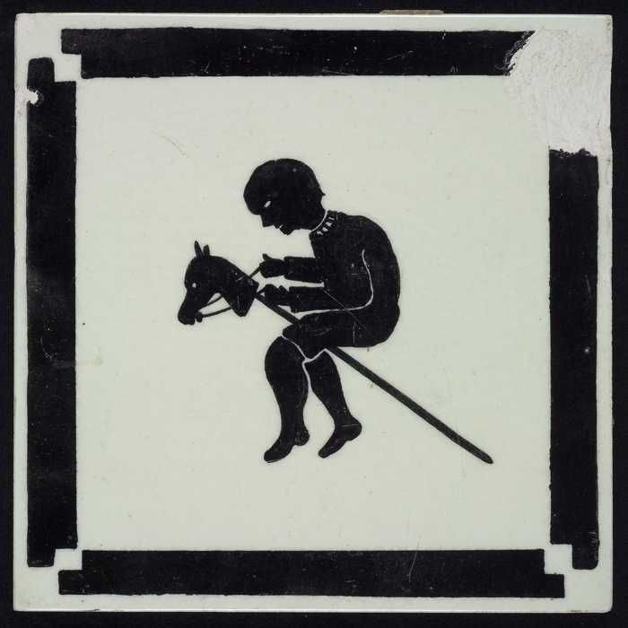 Kindertegel, zwart op wit met jongetje op stokpaardj...