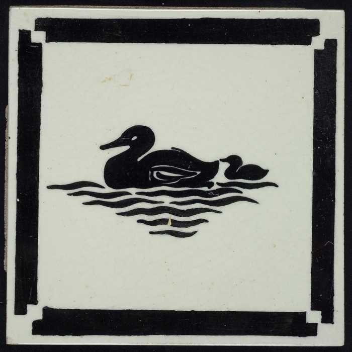 Kindertegel, zwart op wit met eend met jong, randmot...