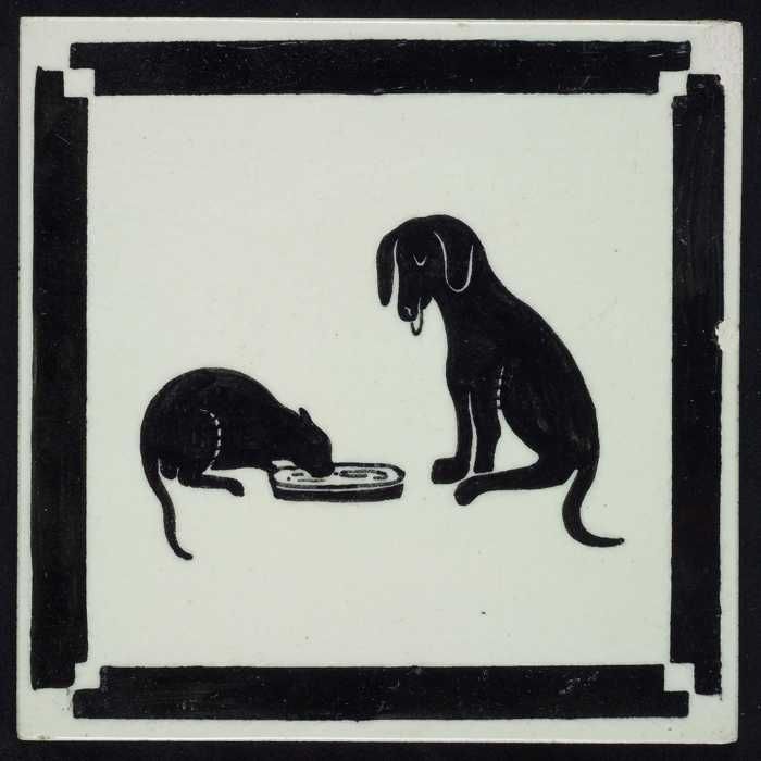 Kindertegel, zwart op wit met hond en kat met drinkb...