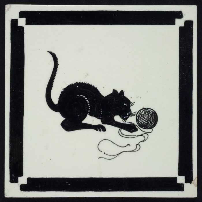 Kindertegel, zwart op wit met een kat spelend met ee...
