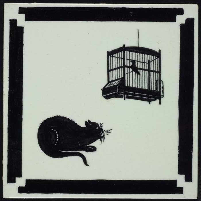Kindertegel, zwart op wit met een kat loerend naar e...