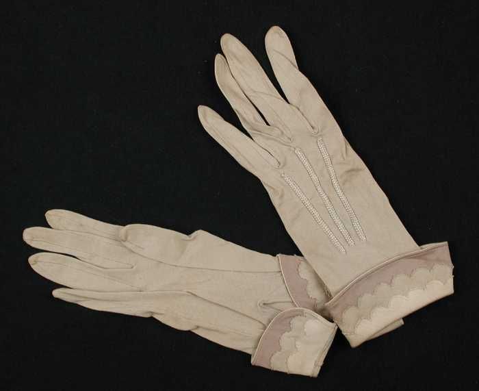 Paar korte dameshandschoenen van beige tricot katoen...