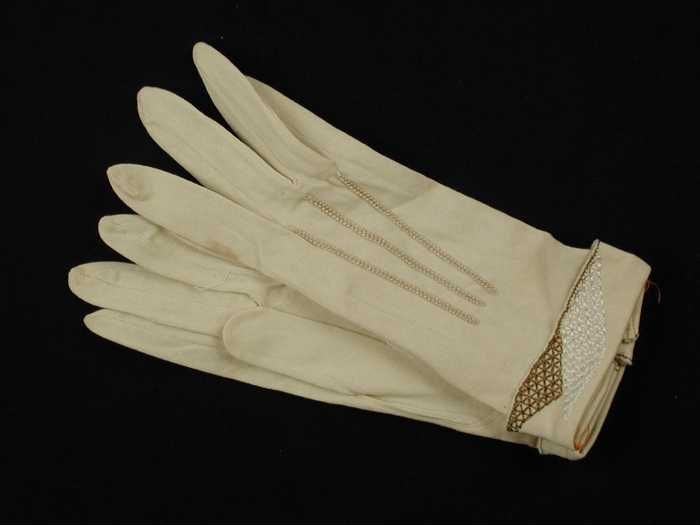 Paar korte dameshandschoenen van crèmekleurig tricot...