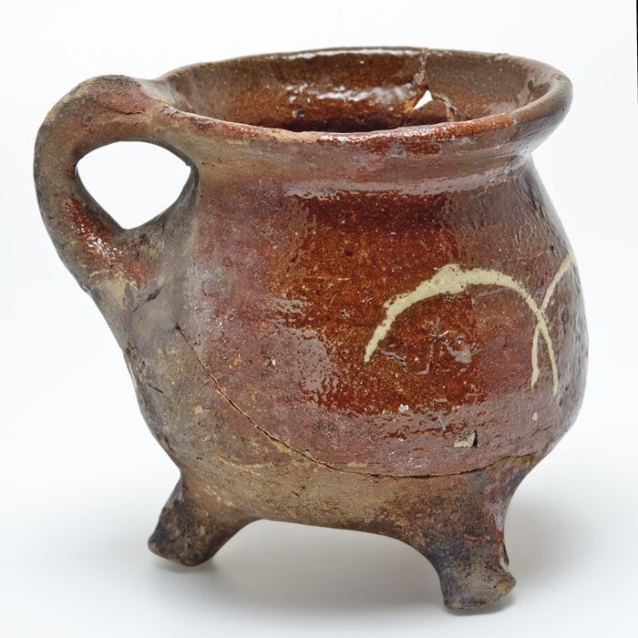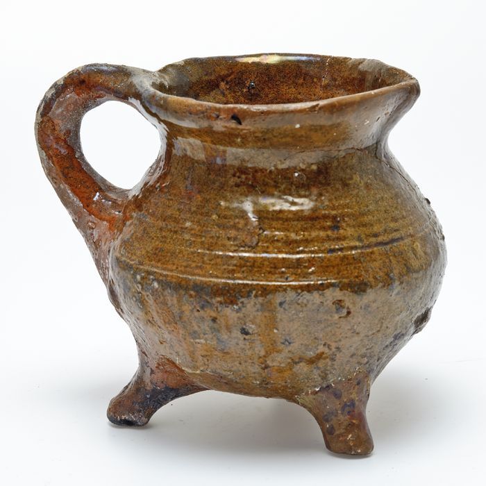 Kleine aardewerk kookkan op drie poten, worstoor, ve...