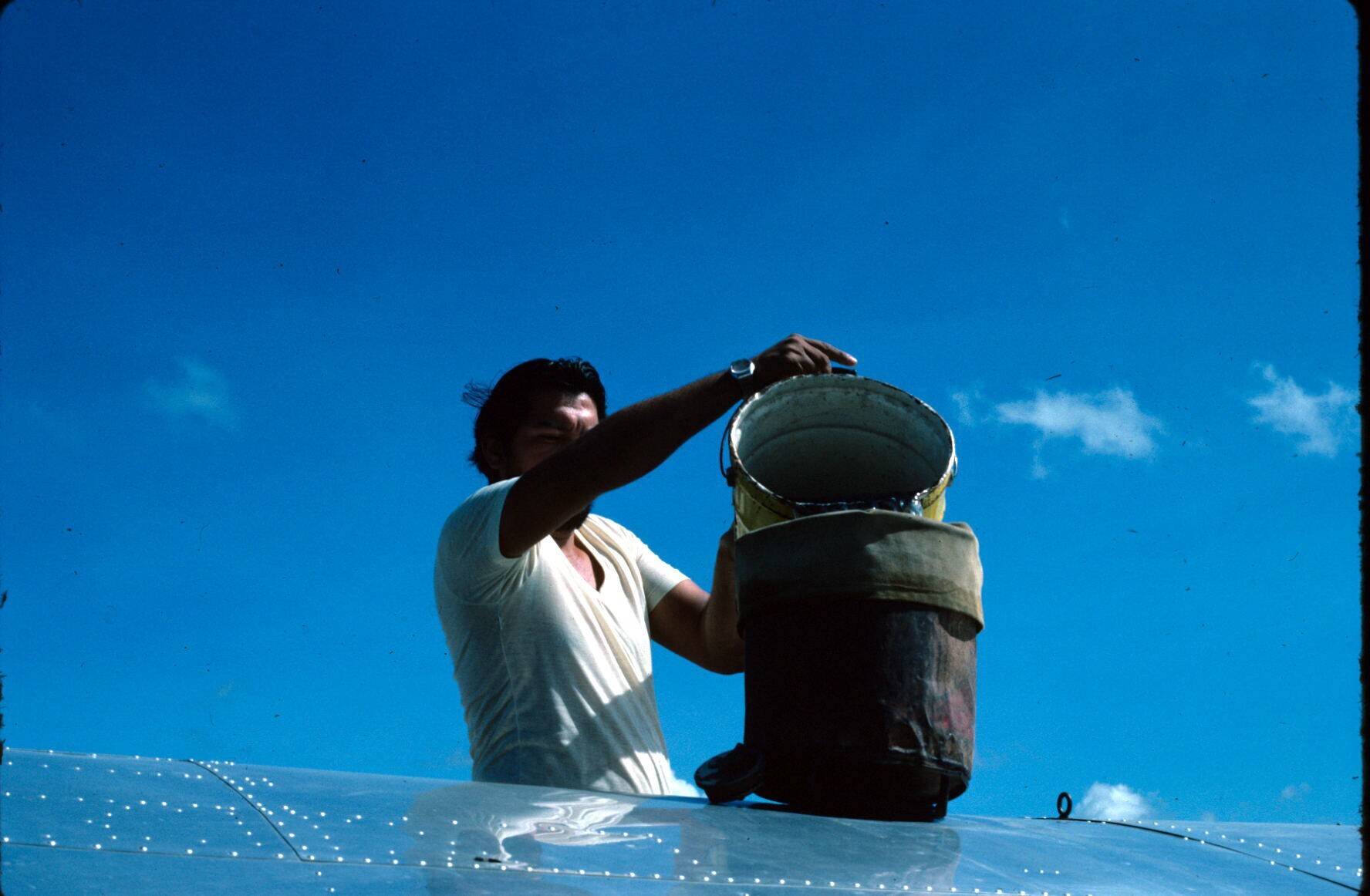 met blik en trechter brandstof bijvullen van "avione...