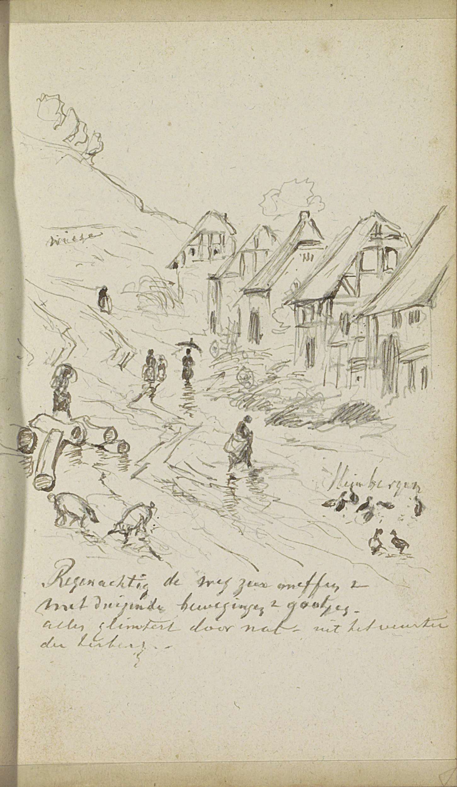 Figuren, zwijnen en vogels op een dorpsweg in de regen