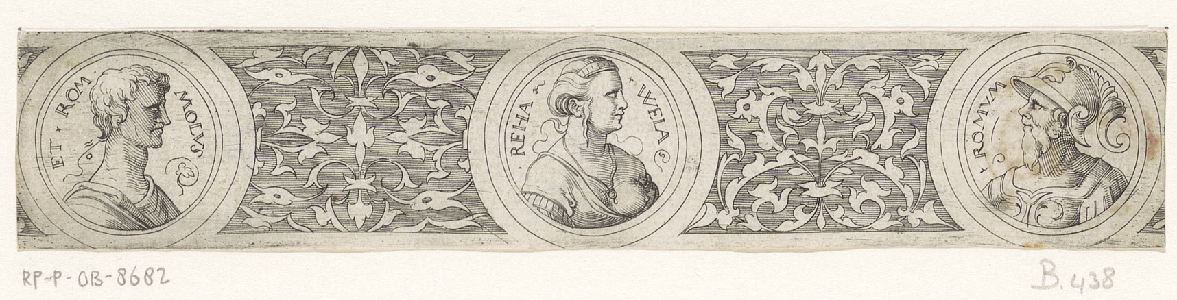 Fries met drie bustes van vrouwen omgeven door gebla...