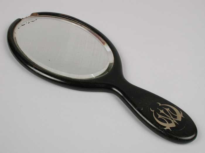 Donkere houten handspiegel met ovale spiegel, zandlo...