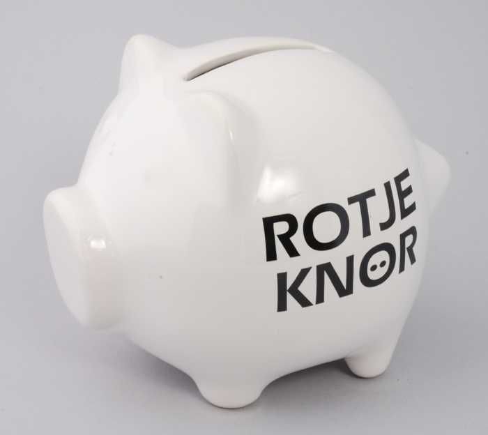 Porseleinen spaarvarken met opschrift "ROTJE KNOR"