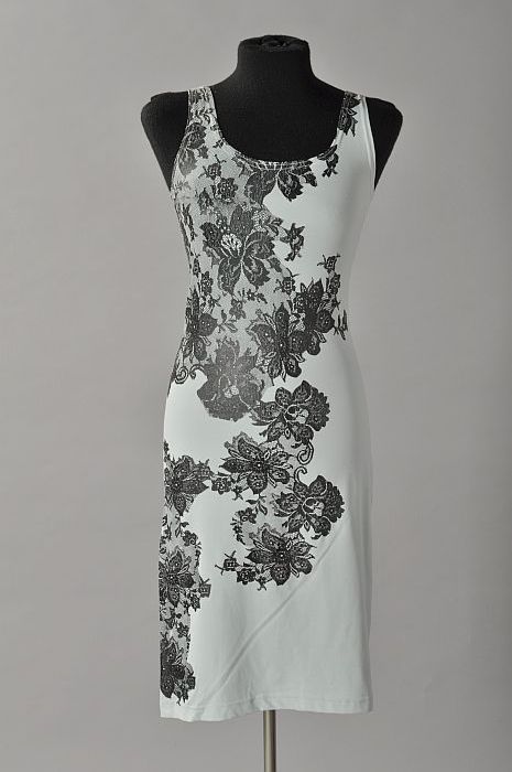 Jurk van lichtblauwe stretchstof met opdruk in zwart...
