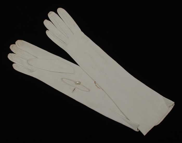 Paar ellebooglange handschoenen van wit glacé-leer, ...