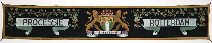 Rood en blauw fluwelen baldakijn-processievaandel "J...