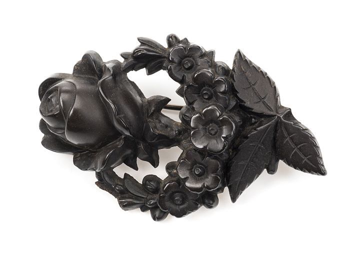 Rouwbroche gesneden uit ebbenhout, een rozentakje me...