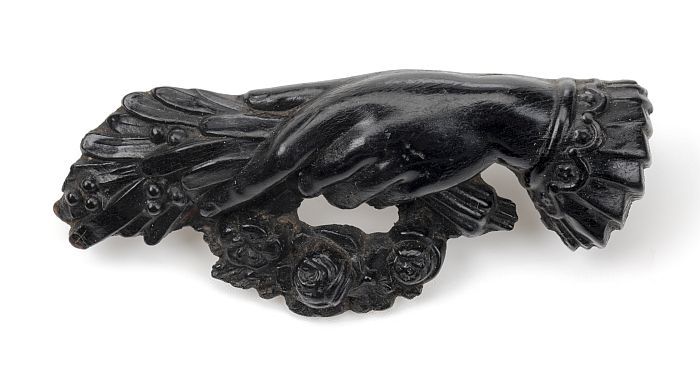 Rouwbroche in de vorm van een vrouwenhand met een ta...