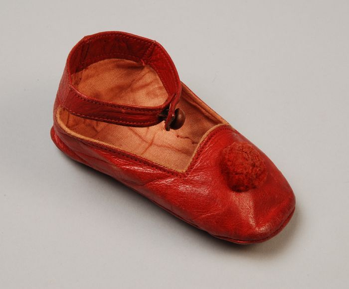 Één rood leren babyschoentje met wollen pompoentje o...