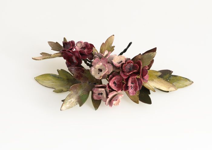 Broche of corsage van roze bloemetjes en groene blaa...