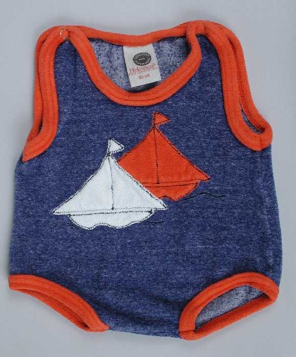 Babypak of rompertje van blauwe badstof, met rode en...