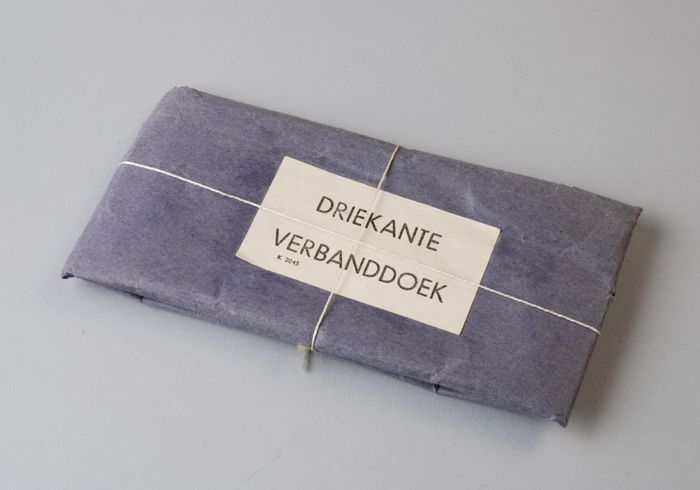 Driekante verbanddoek in blauwe wikkel met touwtje