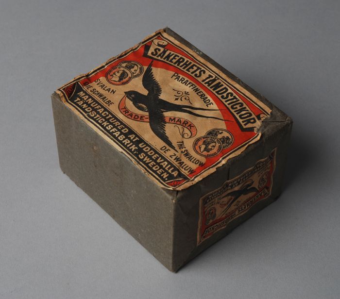 Donkergrijs pak met tien doosjes lucifers, met "Sval...