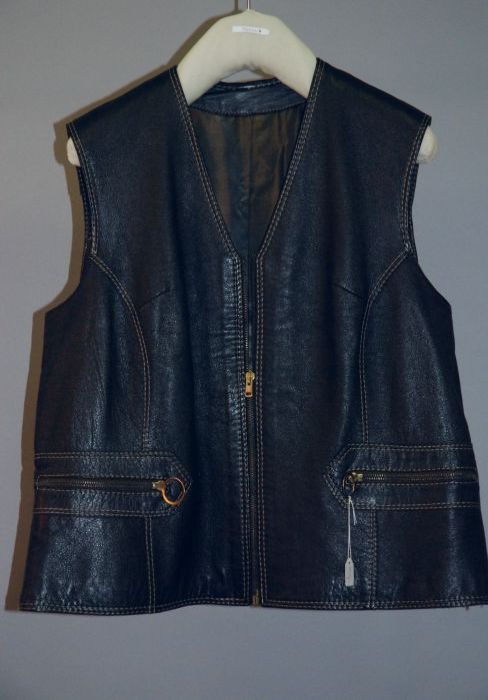 Tweedelige japon van donkerbruin leer, mouwloos vest...