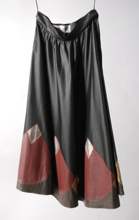Zwarte satijnen lange wijde rok met leerapplicaties ...
