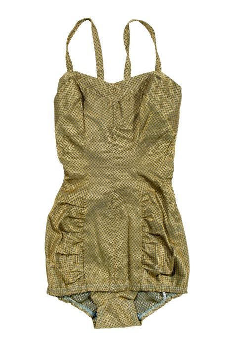 Grijsblauw badpak met motief van goudkleurig garen i...
