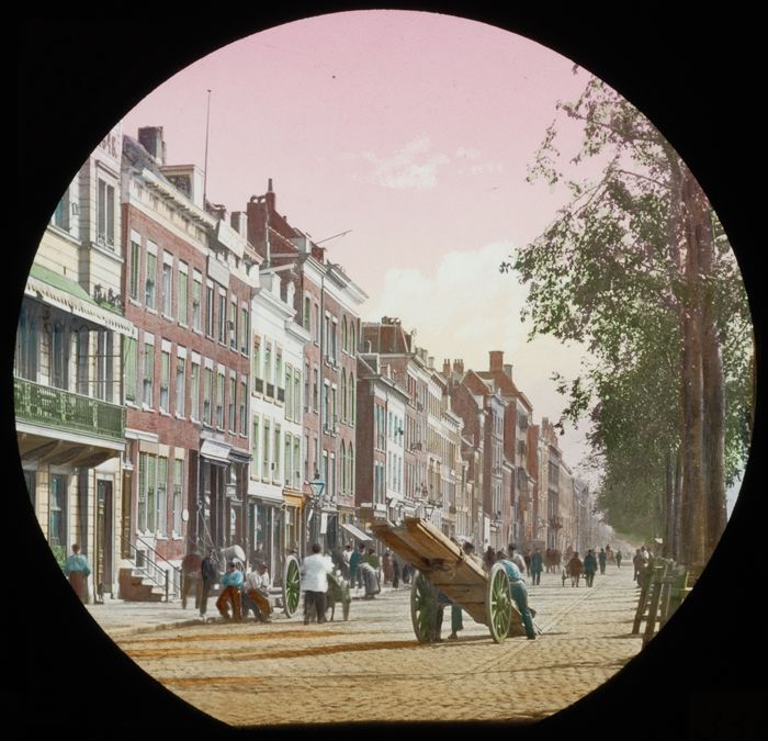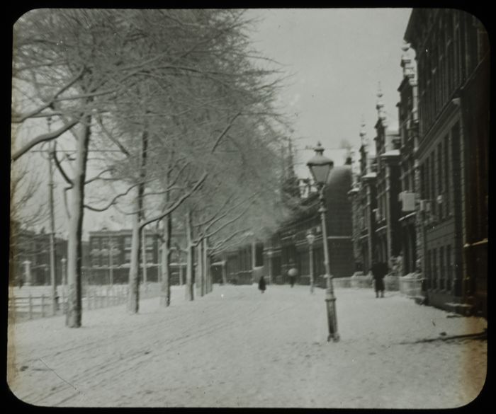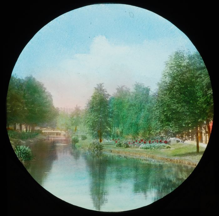 Handgekleurde glasdia van de Noordsingel in de zomer